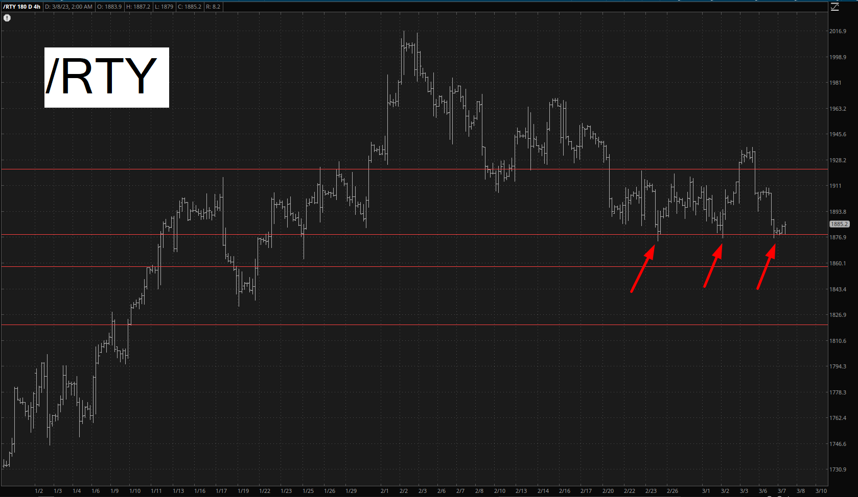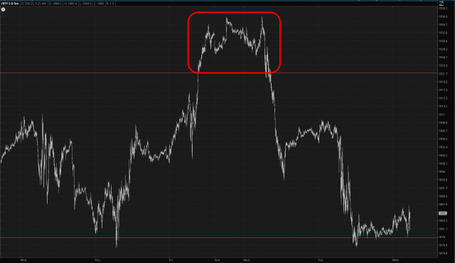Taking a big step back, you can see these series of horizontals (again, NONE of them Fibonacci-based) on these futures. A failure of this line would be, shall we say, glorious.