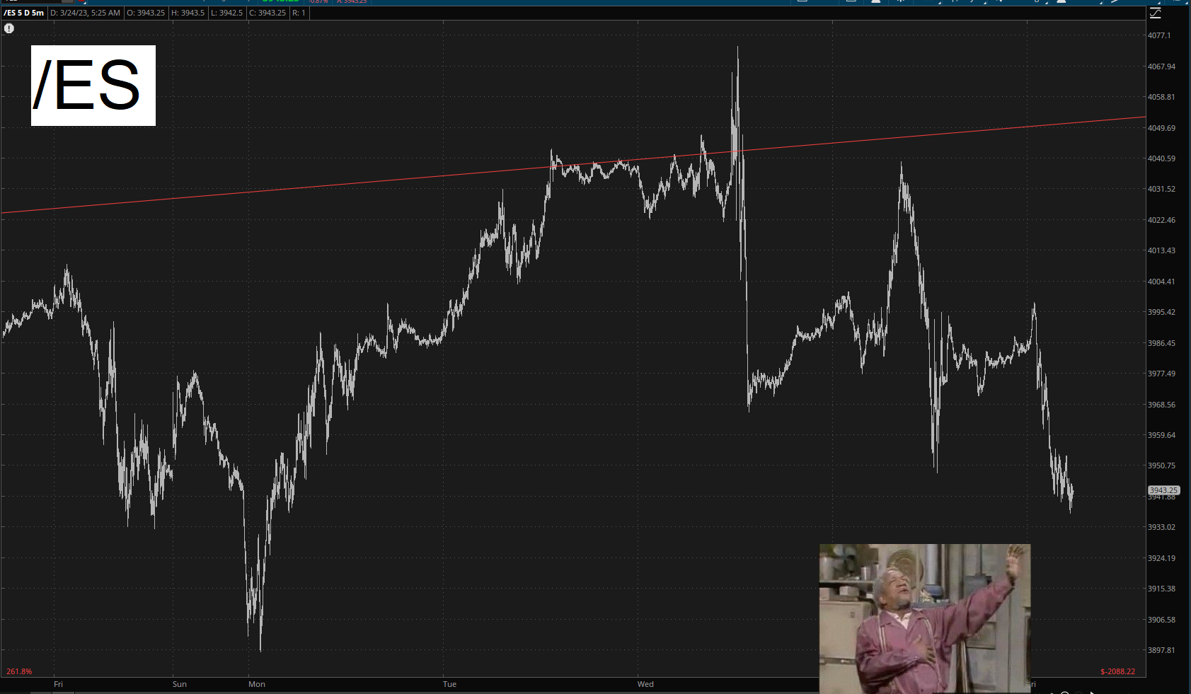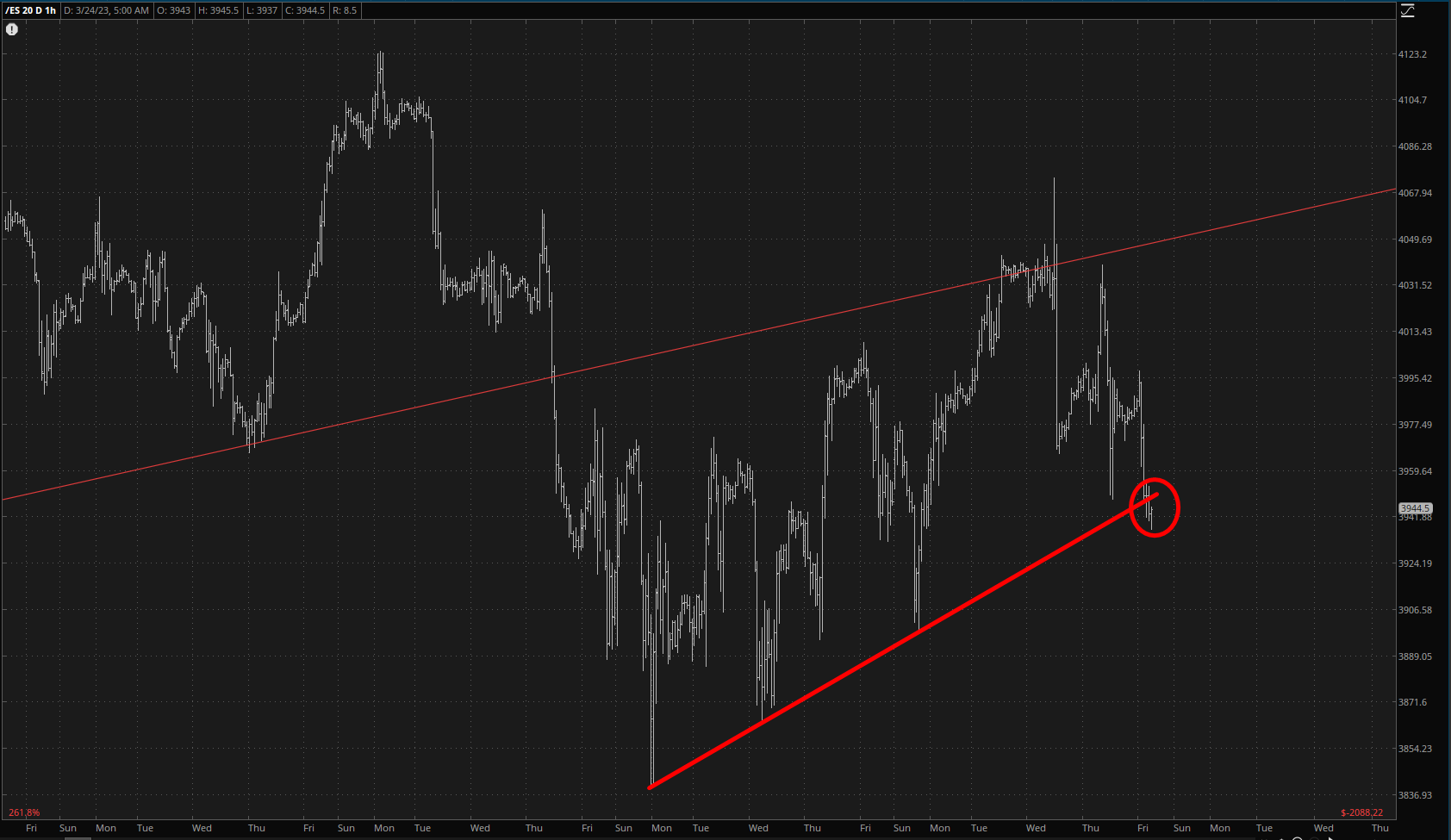 Thus, when I woke up at 5 a.m. and trotted over my home office, I was eager to see what was happening. How pleased I was to see an entirely red screen of futures quotes, as the /ES took another cardiac arrest lunge lower.