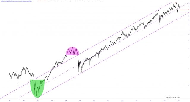 It isn’t often that my ideas nail an exact top or bottom, but this is an exception: on December 14 of last year, I did a Premium post cleverly titled Utilities, Utilities, Utilities, and at the time I wrote quite plainly, “My view is that this sucker is about to roll over in a massive way.” Let’s see how that worked out: