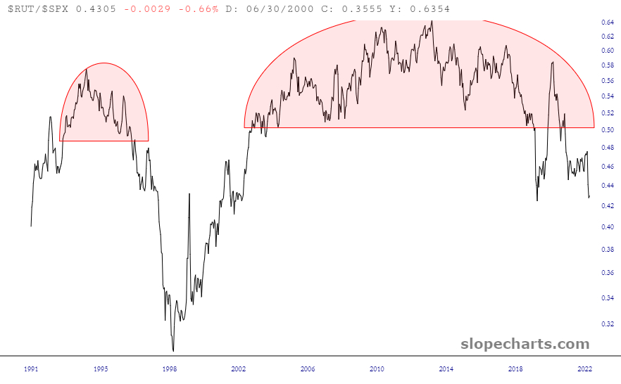 This one simple chart speaks volumes: it represents the ratio of the Russell 2000 cash index to the S&P 500 cash index. As you can plainly see, there is a fantastic top formed (vastly bigger than the prior one, which was way back in the mid-1990s) and speaks to substantially lower prices ahead.
