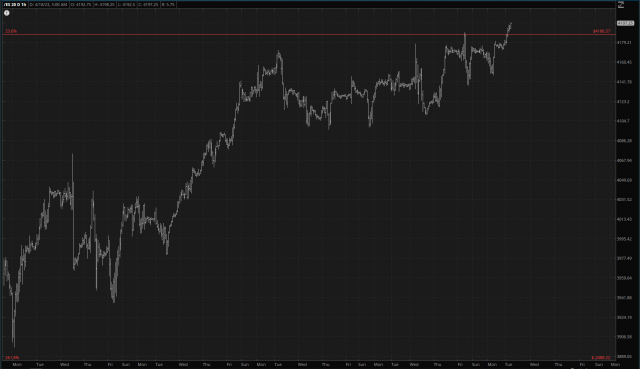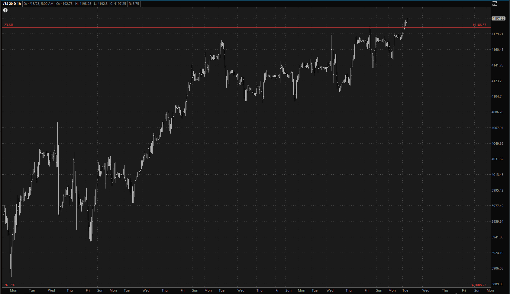 Good morning, Slopers. Well, the wind continues to fully inflate the sails of the U.S.S. Bullish, as the world’s most protected and enriched “free” enterprise sector, the big banks, continues to produce excellent earnings. It’s sort of like celebrating that the Army and Marines secured funding for the year. It’s kind of a guarantee. In any event, the /ES has pushed based the Fibonacci retracement (red line) and is sporting a very saucer dish, ready to rock higher.