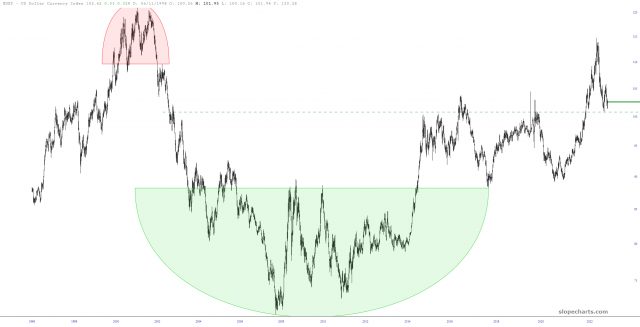 Of course, we could look at this in a macro sense by way of the dollar index ($DXY) which seems to my eyes to be rather bullishly-formed, provided it stays above that dashed line.
