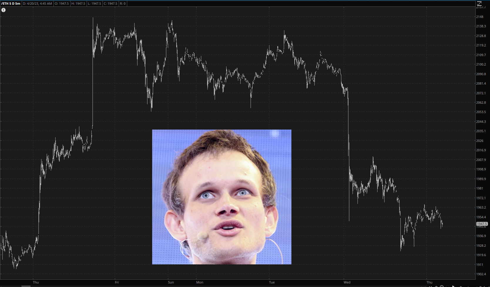 Yet another factor that is helping asset prices soften is crypto, which until recently was leading the way higher, 2021 style. Below we see Ethereum futures (embellished with an image of Ethereum’s incredibly creepy-looking creator):