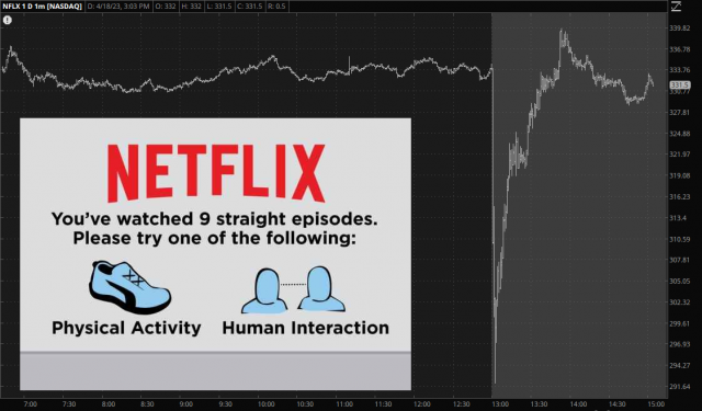 The other crazy one (in which I’m also pleased to have no position) is Netflix. What an emotional roller coaster this has taken people through in a short span of time. The moment earnings came out, it lost about 10% of its entire market cap, which I’m sure thrilled put owners. These same people are probably livid now, because the entire loss is gone (indeed, it was actually POSITIVE for a while!) The biggest winners here are option sellers, because this sucker looks like it’s going to come out of this thing virtually unchanged.