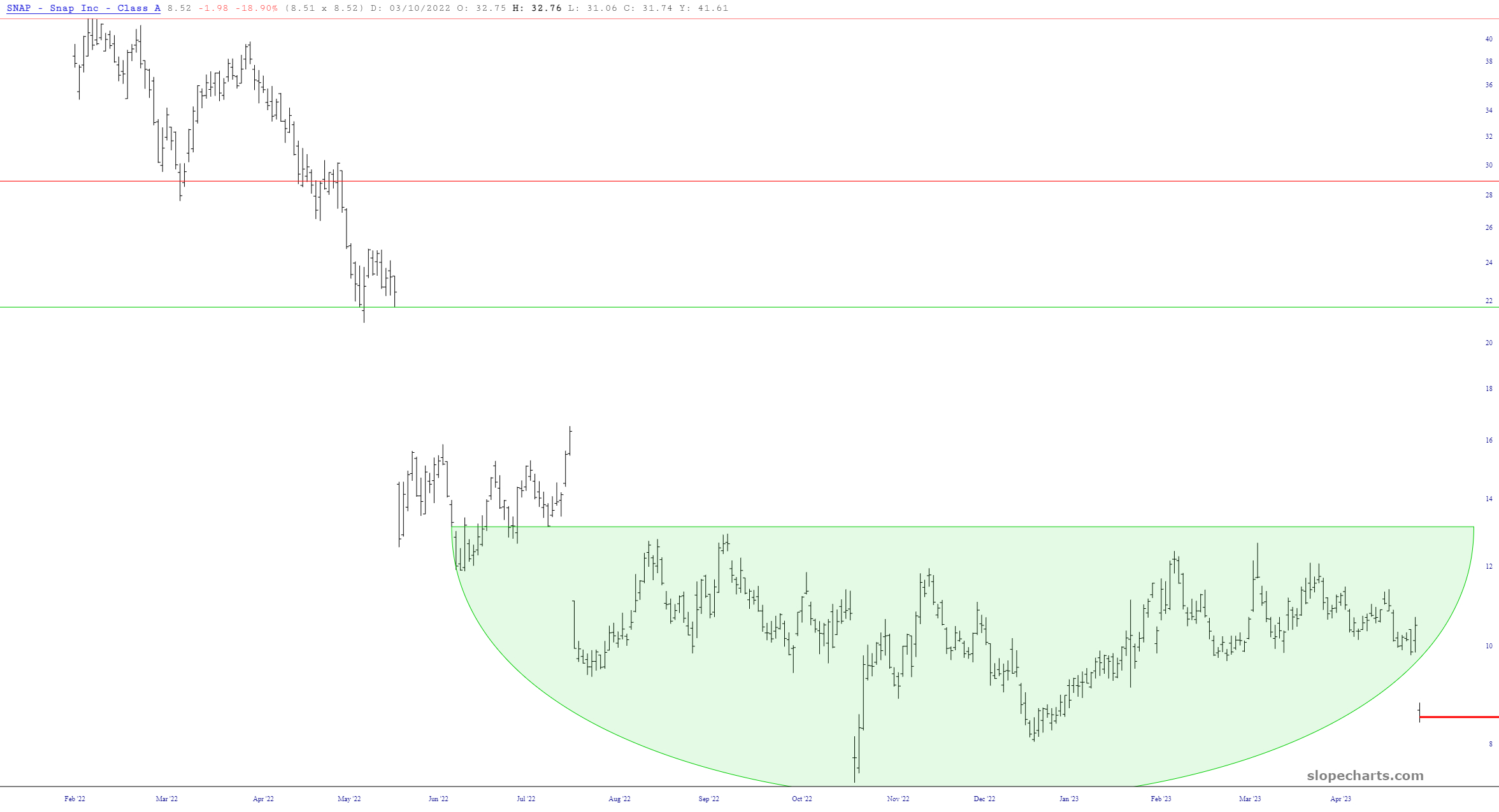 A point I’ve been making a lot lately, particularly on my tastylive show, is not to get seduced by classically bullish patterns in the context of a bear market (and, yeah, it’s still a bear market, the last two days notwithstanding). Below are two examples of stocks which, in a normal environment, would have been gorgeous saucer bases, but instead they were total fake-outs. Context matters! Here are PINS and SNAP: