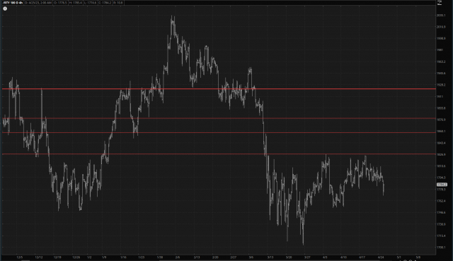 A far more intriguing chart may be found with the small cap futures, the /RTY, which over a period of months have hammered out a beautiful shape. This is actually an electrifying chart, because my concern has been that the bullish run following the basing pattern on the left side would be echoed with the basing pattern on the right. Indeed, the basing pattern on the right was substantially larger, and I feared a piercing of resistance at 1827.40 would encourage our dear, dear bullish friends to send prices rocketing higher. Well…………..no.