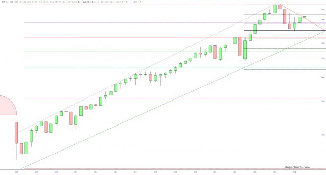Here we see the quarterly bar chart of the S&P 500 during the entirety of this Everything Bubble. The penultimate large green bar represents Q1, whereas the rightmost small bar (which is unfortunately above resistance now) is Q2 so far.