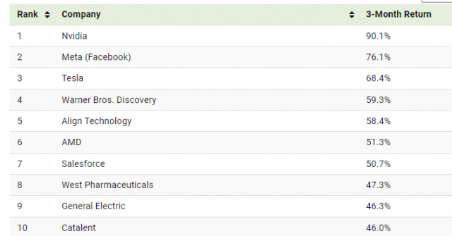 The top gainers were, naturally, mostly tech, with graphics card maker Nvidia at the top of the heap, nearly doubling in price in just one quarter.
