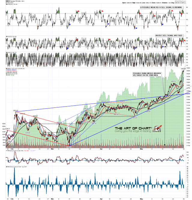 NDX has been leading strongly to the upside and I mentioned a couple of weeks ago that the very nice rising wedge from the March low there might break up. In that event what I watch for is a backtest that doesn’t break back below the rising wedge resistance trendline, and as long as that holds, as it did on the backtest last week, the rising wedge target here would be in the 17000 area. That may be what we are looking at here and we should have a better idea about that by the end of the week.