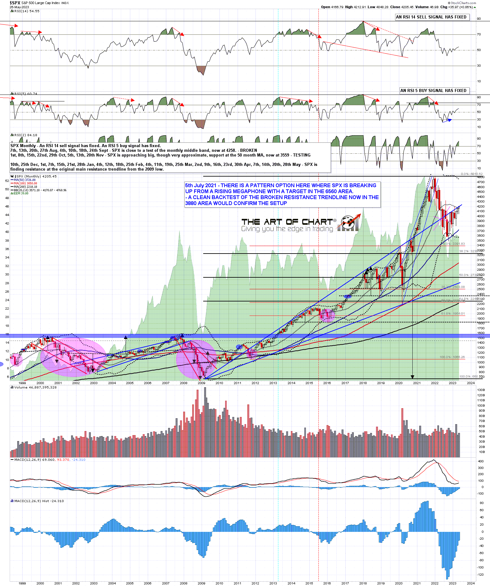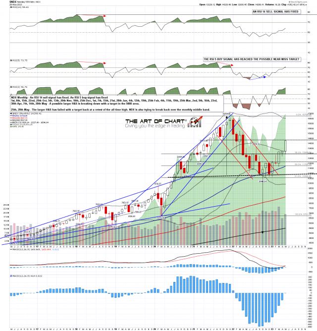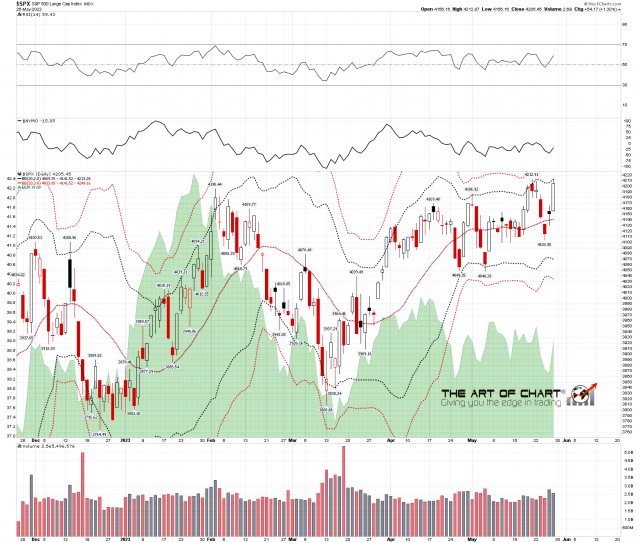 At the start of May there were two big indices testing strong resistance at the monthly middle band. That is at 4170 on SPX at the moment and we may see a modest break over that resistance at the monthly close tomorrow. That would be a significant technical break, though it would need a confirming close above next month.