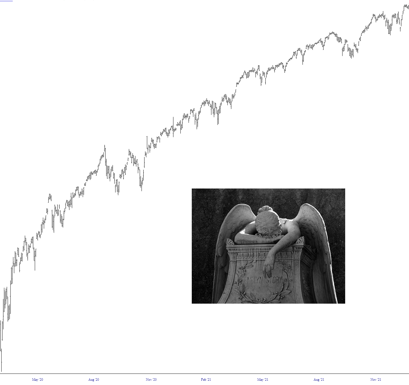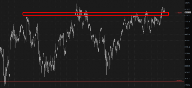 That’s the magic of scale, though. The above chart looks like my kind of dream market, but you know as well as I do that it simply shows the /ES in recent hours falling a fraction of a percent. On a more meaningful time scale, all we’re doing is grinding away at the upper bounds of an agonizing range that’s been in place since Mamie Eisenhower was seriously being considered for the cover of the Sports Illustrated swimsuit edition. (Oh, but how far we’ve come).