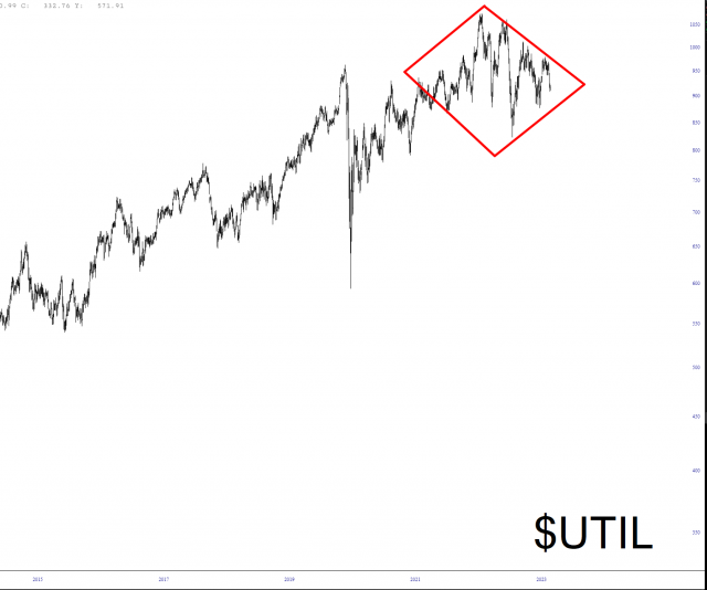 I will point out something a bit obscure worth mentioning, which is the well-formed diamond pattern in the Dow Utilities. Who cares, you ask? Check back in a year.