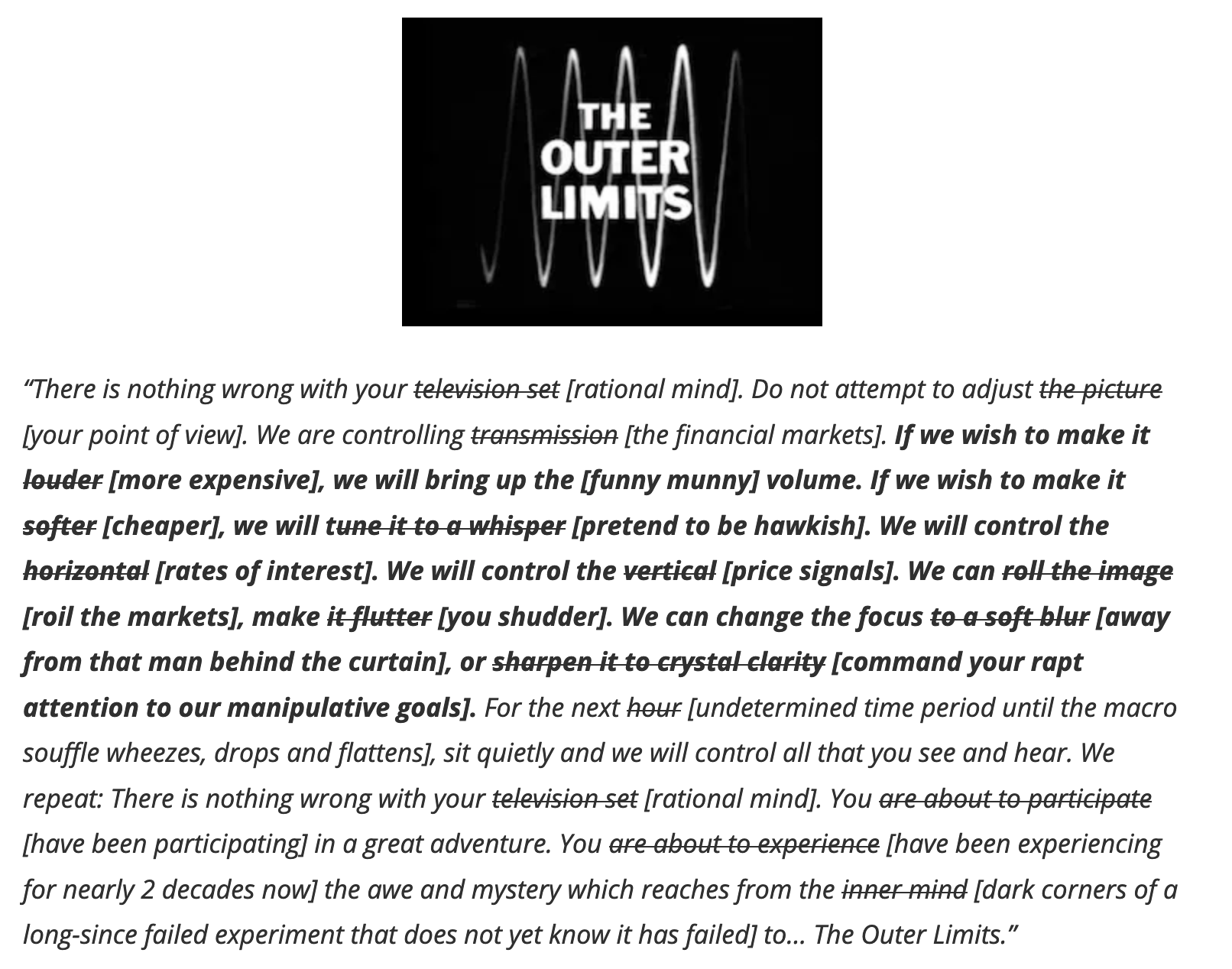 ** Today’s Fed is not indicated to have lost control. Quite the contrary; the Wizard is in full control as the market obsesses on every word out of its collective, and tardy orifice.