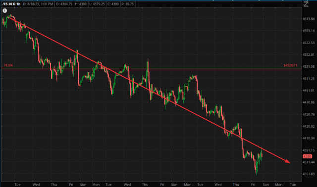 Glancing at the recent price activity of the /ES, it would be easy to shrug one’s shoulders and assume that things just keep slip sliding away. Now, I am creating this post several hours before the futures open on Sunday afternoon, so I have no idea what those quotes are going to look like, but as I sit here prior to the week starting, I am banking on (and hoping for) some strength early on.