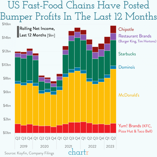 Here are some eye-opening graphics. Here we can see that fast foot profits are coming in strong, with McDonald’s continuing to be the most obese beneficiary.