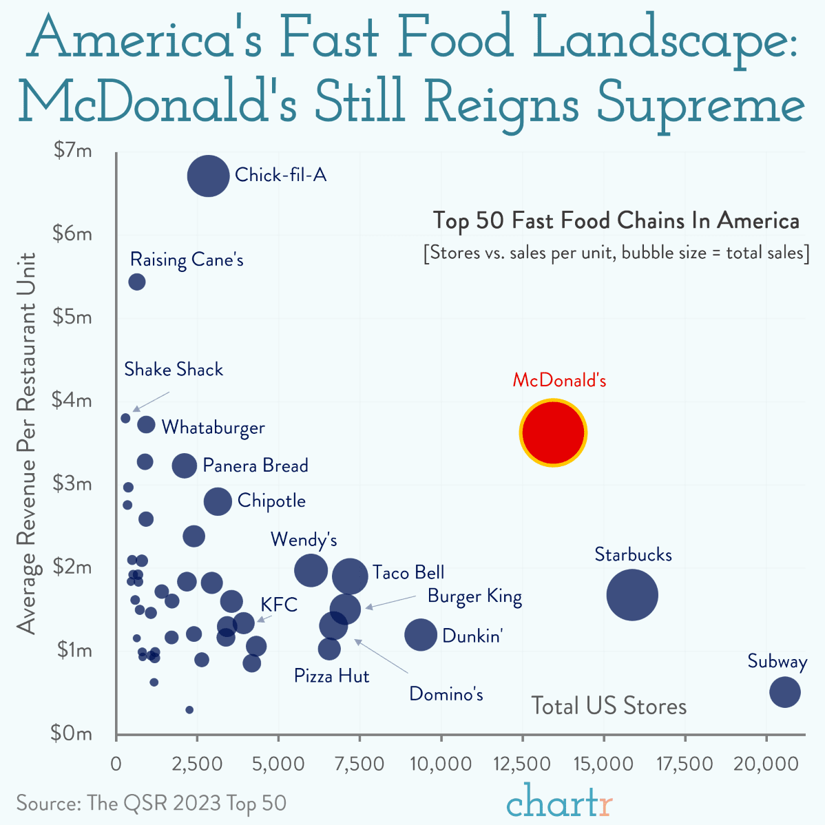Two things caught my eye about the chart below. First was how much more revenue Chick-fil-A (which I’ve never entered in my life) has than anyone else. I mean, look at Subway – – they are slummin’ it! The other item was “Raising Cane’s”, which not only have I never patronized but I’ve never even heard about. I was proud to see they emerged from my boyhood town of Baton Rouge, Louisiana, which makes me an instant fan.