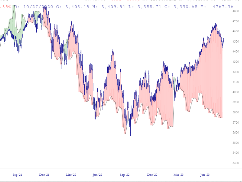 Now, I realize “the formula” is outdated since Yellen created her illegal BTFP program, but all the same, I present to you the Fed Spread, showing the delta between present price levels and where they should be. It is a ball-numbing 600 points. Never, ever bigger.
