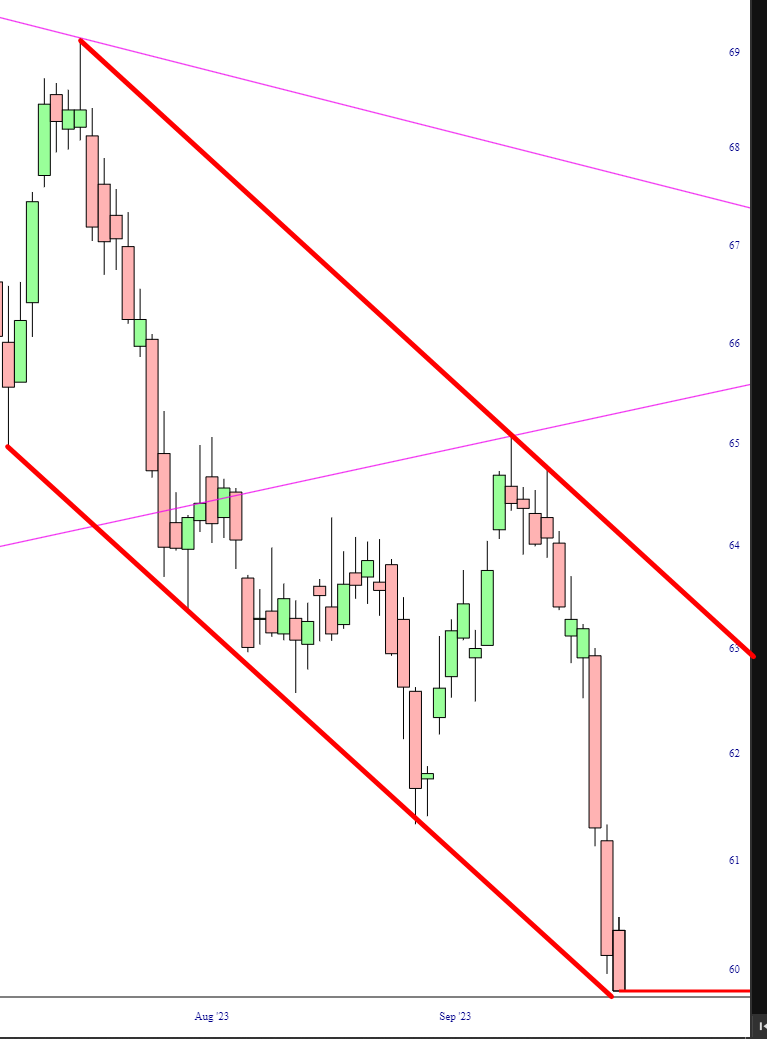 Wow. Precious metals continue to defy their moniker. Gold has failed a large right triangle top.