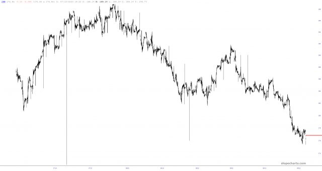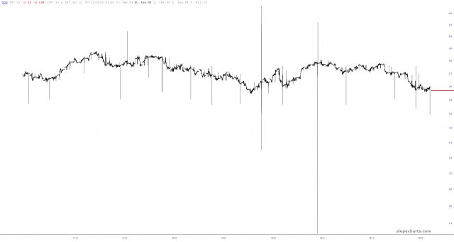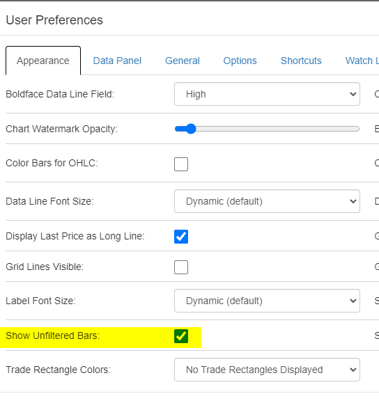 Financial data is dirty. And by that I don’t mean it’s half wrong. Even if it is 99.5% clean, that’s not good enough, because just a few crap data points can wreck a chart’s scaling and, thus, its utility. Years ago, I remedied this by having daily data subjected to our filtering mechanism. You can turn this on and off within the Preferences dialog box of SlopeCharts.