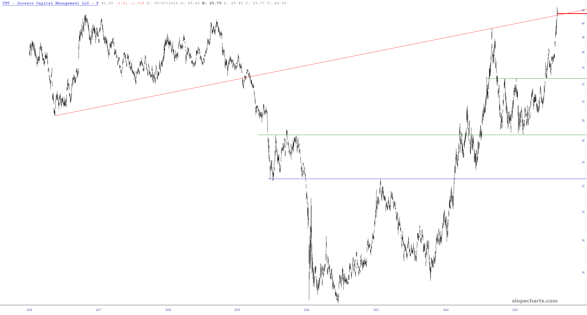 I have made clear that I’m long XLU in a big way. My view is that interest rates have topped out for the moment, as illustrated neatly by the ultrashort fund on bonds, symbol TBT.