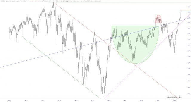 The Dow Industrials has been exceptionally strong and is actually very close to its highest point in the history of the universe. Pretty shocking, eh? Honest to God, we’ve gone from full-scale breakdown to inexplicable melt-up, so it’s a hell of a thing to untangle. I’ve been doing this all my life, and I honestly have no clue.