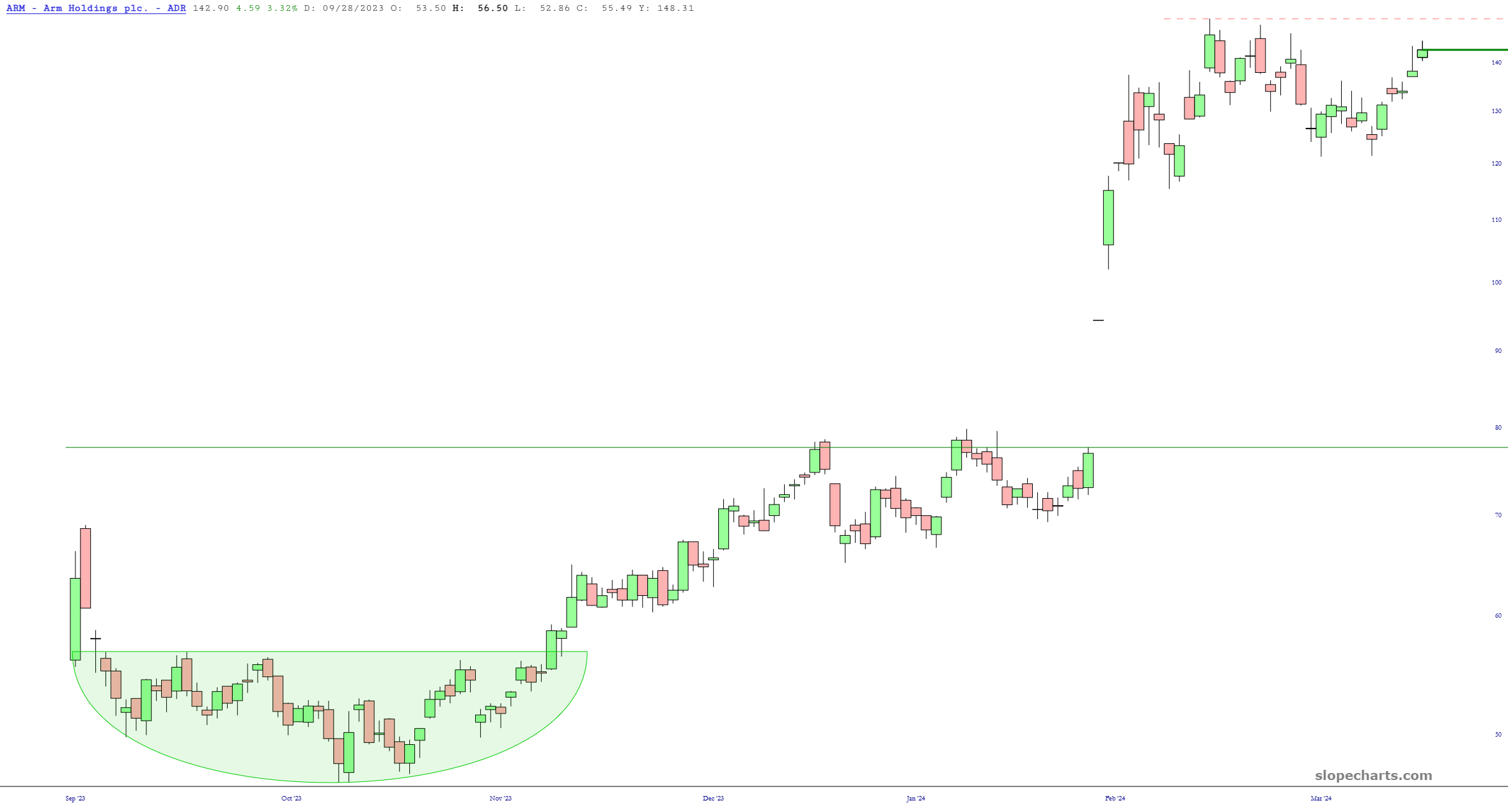 Softbank’s ARM Holdings (ARM) is holding firm and is likewise threatening a new breakout, similar to Nvidia’s, although obviously this is a much younger stock.