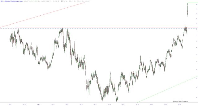 Micron (MU) has been the belle of the ball lately. This has formed an enormous base, and once it was based that horizontal, whoosh, it was off to the races! This entire sector is getting SO expensive.