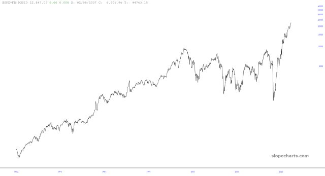 I tried something a little different with MICE: multiplying by the 10yr yield. Bonds are going down in price as yields rise. At some point, they must be the better buy, and the market tops. I don’t know that the level matters for predictive purposes, but the spikes since 2000 have all been proximate to tops.