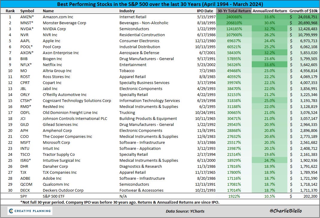 The table below is fascinating, because it shows the jaw-dropping power of compound interest (as well as how much a different a small percentage makes over the long haul). The top performing stock over 30 years from the S&P 500, AMZN, had an annualized return of 33.6% whereas Microsoft, another mega-tech giant, provided 20.3%. Both excellent returns, right? The difference is that, over the past 30 years, $10,000 would have grown to $2.5 million with MSFT but $24 million with AMZN!