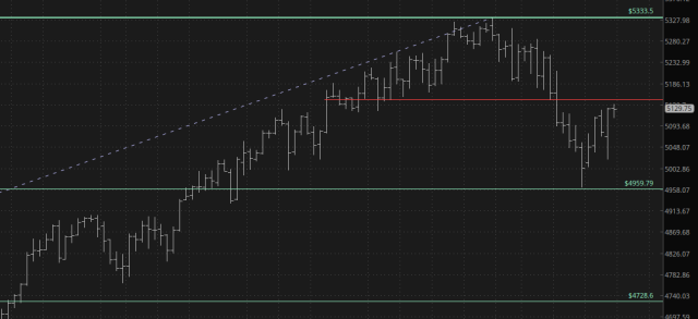 The /ES, shown above as a minute bar, and below as a 30 minute bar, is still hemmed in by an important resistance level.