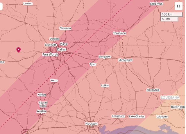 I am not easily daunted, however, so I have already expressed to my compatriots that we will get up at any hour and drive any distance (well, *I* will) in order to find a hole in the sky. As of this moment, which is a full 30 hours before the eclipse, I am targeting northeastern Texas, pretty much near Texarkana, although these plans are at the mercy of the forecasts I will examine Monday morning.