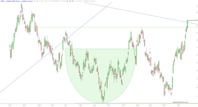 Gold has been doing great (which I celebrate, not only because I own a bunch but also because it represents a knitting needle thrust into the eyeballs of central bankers). Miners have, at long last, confirmed this move, with both GDX and GDXJ blasting past resistance levels. Huzzah!