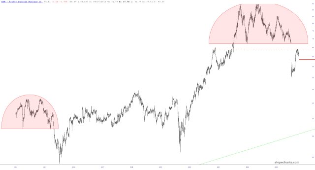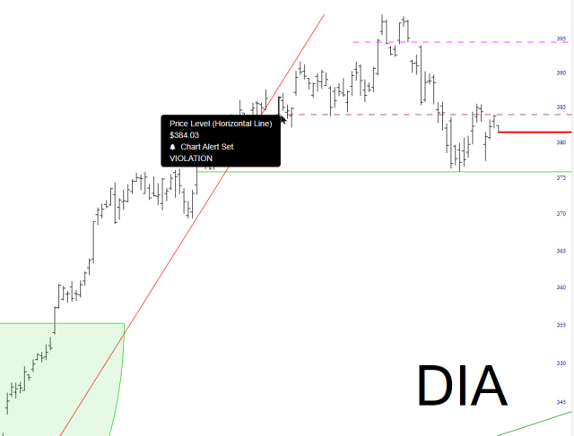 I’ve had it up to the proverbial “here” with semiconductors, so I dumped the one true loser in my portfolio, my SMH puts. In exchange, I went into Dow 30 ETF puts (the “diamonds”) which , unlike SMH, doesn’t go up every freakin’ day. My stop loss on this is anywhere above 384.03: