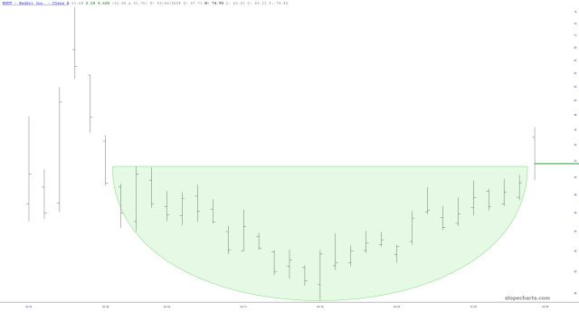 Reddit had their first earnings report as a public company, and the stock exploded last night. It’s still up, yes, but it isn’t exactly following through. I would look at this breakout from the base with great skepticism.