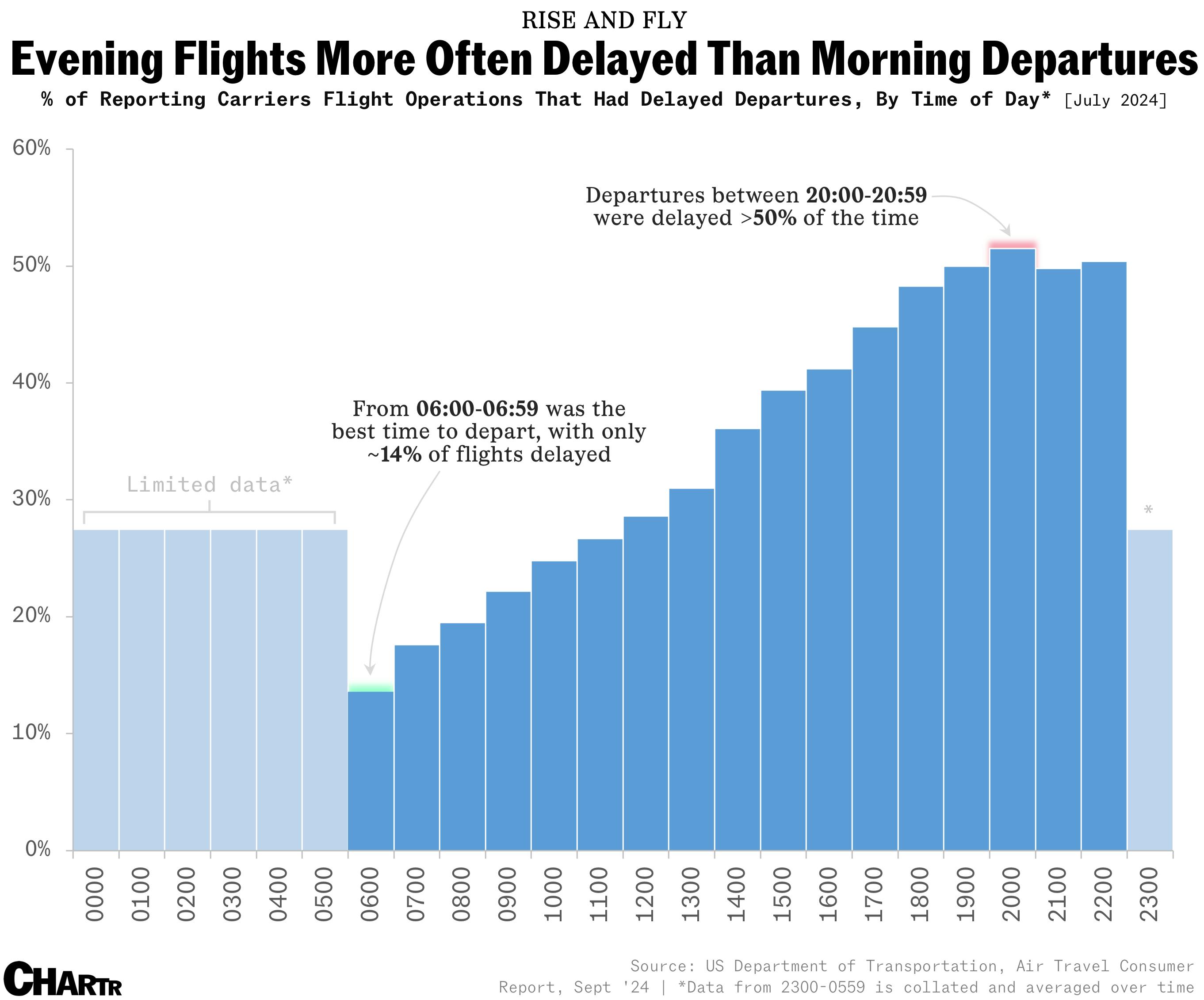 This graph makes a lot of sense: if you want your flight to leave on time, pick an early one! As the day wears on, stuff happens, and that stuff piles up into increasingly bad delays.
