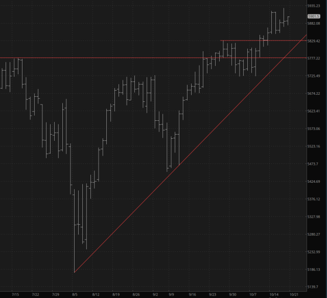 The media, and permabull ZH in particular, is absolutely slathered with articles saying precisely the same thing: that there’s going to be a GOP sweep on 11/5, and coupled with seasonal tendencies, the market is absolutely going to soar into the ionosphere. Could be. The daily pattern on the /ES shown here is indeed quite bullish.