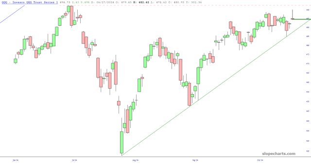 Below are the SPY and QQQ (both of them with more recent data) with the exact same line. The shooting star for the QQQ adds more sauce for the goose.
