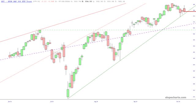 Please direct your attention to all the trendlines anchored on August 5th and September 6th of this year. This constitutes a crucial medium-term support level which, if breached, should get things cookin’ for the bears (for a change). Here is the /ES: