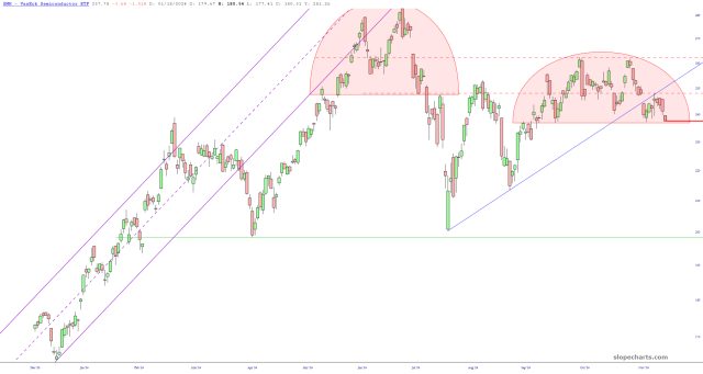Well, semiconductors are once again my friend! It’s exciting, because the entire industry is starting to crumble. This is beautifully represented by my biggest position, SMH $265 puts. I’ve drawn a new rounded top to illustrate what has just happened this morning.