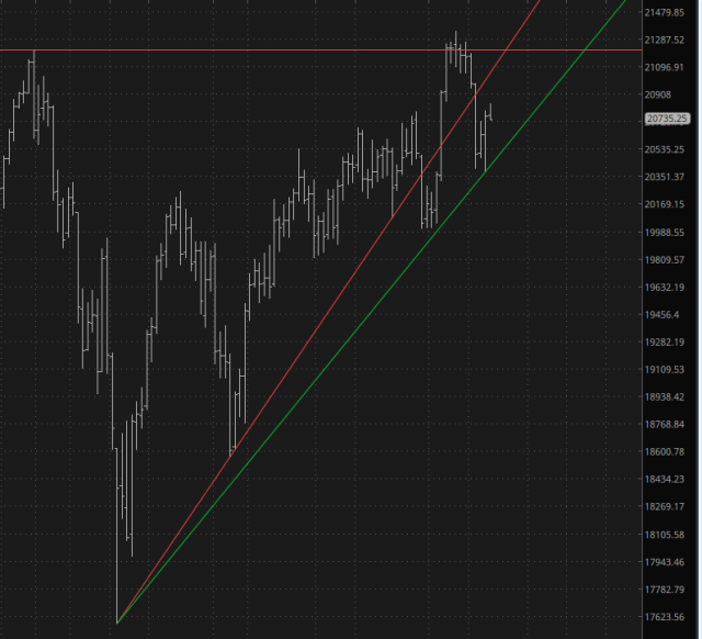 I want to emphasize once more the importance of these NVDA earnings. We’ve already broken the trendline on the /NQ (in red), and I’ve drawn another even more conservative trendline in green. My view is that a tumble in NVDA would snap this green line as well.