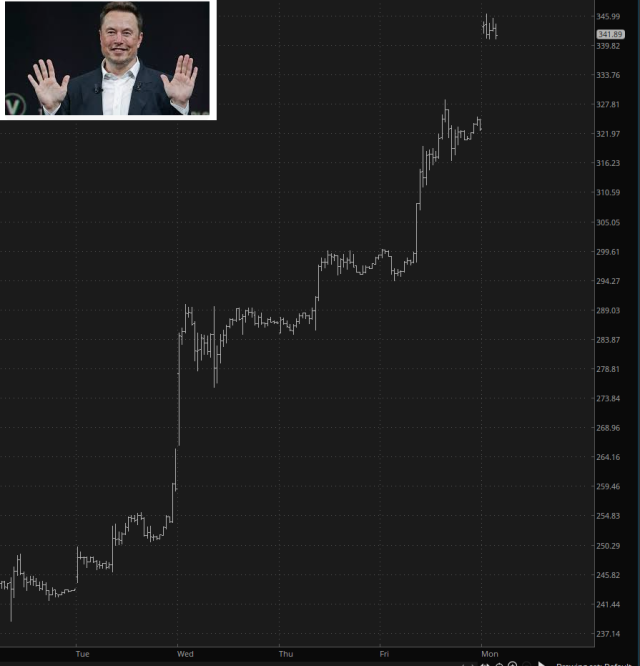 Simultaneously, and unsurprisingly, the Co-President (which I realized is his true title this weekend) Elon Musk is enjoying a continuation of the rise in his net worth, which will be about a third of a trillion dollars today. TSLA is up about $100 per share (!!!!) over the past week.