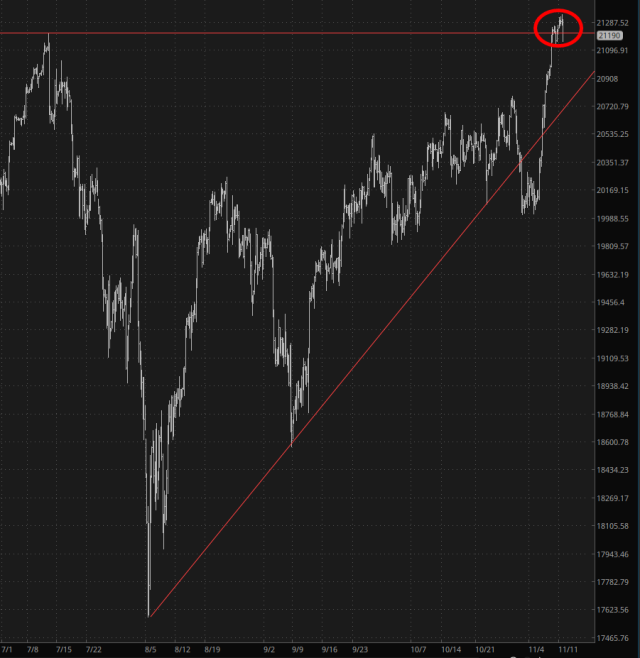 The /NQ reached record highs this morning (of course) but appears to be getting a bit raspy at these levels.