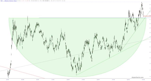 Below is the bigger ETF, symbol SLV, which I am now long. The horizontal is likewise support (and thus my stop-loss).