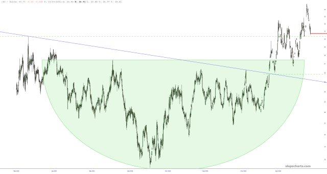 I’ve decided, however, to give this (yet another) shot. Silver seems to be at a possible, and I say again, possible, point of support. Precious metals have looked like absolutely dog poo compared to crypto lately, so in a way this is a VERY contrarian play, because $BTC is super sexy while /SI is a laughingstock.