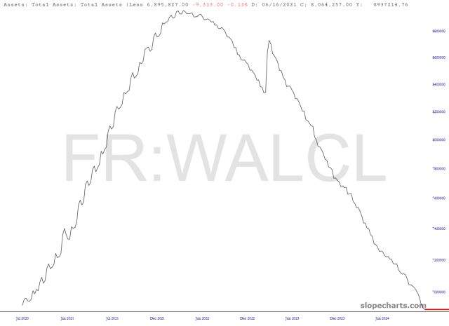 The “extraordinary measures” taken by the Fed during Covid have slowly been tamped down. The assets owned by the Fed have steadily moved lower, although the couple of trillion dollars sold off are dwarfed by the $7 trillion still lingering around Fed coffers.