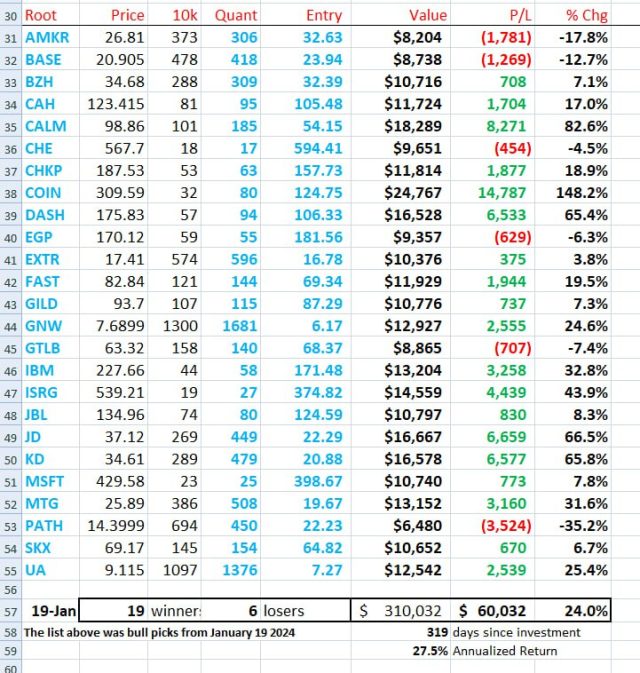 Some more aggressive choices like Coinbase (+148%) and both JD and KD (each up about 66%) made the difference. The worst loser is PATH, which has lost about a third of its value. Oh, and our super-boring friend CALM (the egg seller, of all things) is sporting a handsome 82.6% return since January 19th.