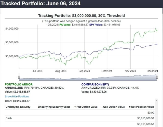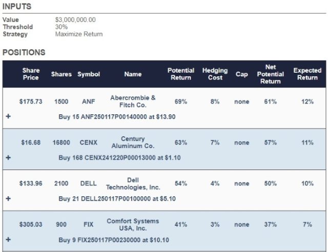 This was the hedged portfolio our system created on June 6th, for an investor with $3,000,000 to put to work who didn’t want to risk a decline of more than 30% over the next six months. Our system started by dividing the money in seven equal parts, and allocating it to Abercrombie & Fitch Co. (ANF), Century Aluminum Co. (CENX) Dell Technologies (DELL), Comfort Systems USA, Inc. (FIX), Powell Industries, Inc. (POWL), and Semtech Corp. (SMTC), in addition to Super Micro Computer Inc. (SMCI).