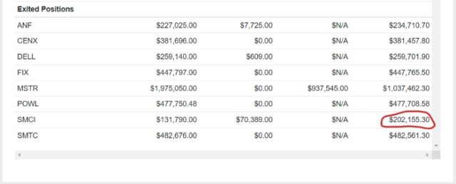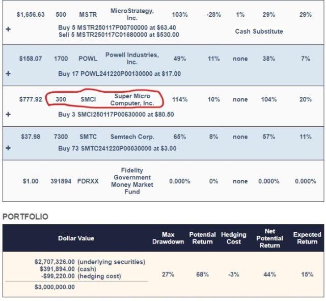 The dollar amount of the SMCI position (circled in red in the image above) at the start was $233,376 in underlying shares and $21,900 in puts for a total position value of $255,276. We’ll come back to that in a moment.