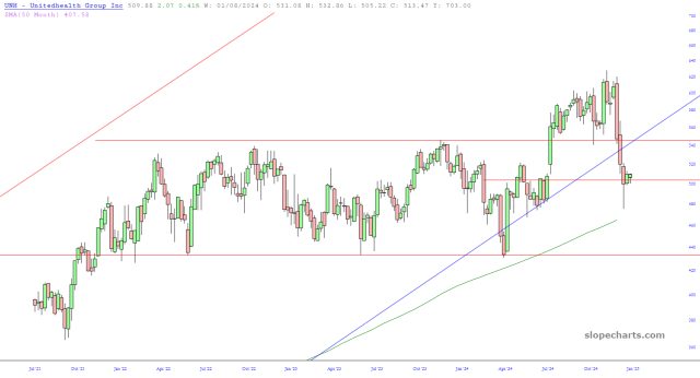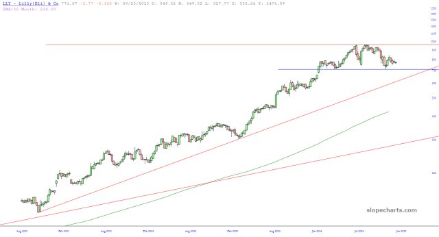 LLY has formed a top, UNH broke the uptrend from 2009, JNJ has broken its uptrend and its 50-day MA.