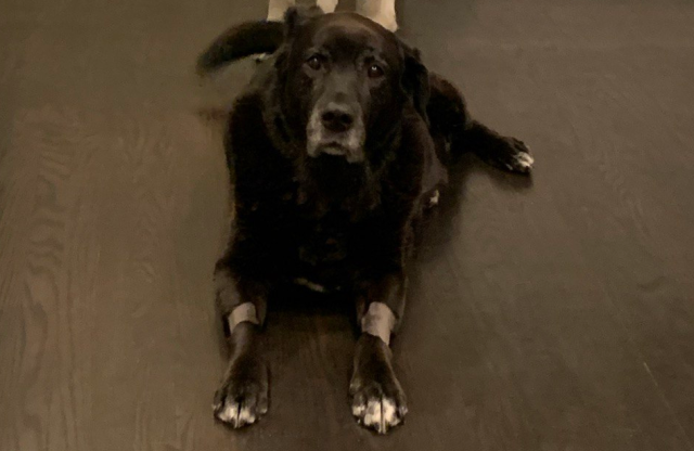 Here’s a photo I just took of Coda in the kitchen, anticipating a fresh batch of ground beef and carrots (note the shorn front legs for the catheters!) She wanted me to thank everyone for their prayers and good wishes and to let you know she’s feeling happy and strong.